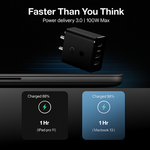 ⚡️🔋【3-in-1 Compact Charging System】100W GaN Charger with 3 Ports – Dual USB-C & USB-A for Phones, Tablets, Earbuds & Laptops